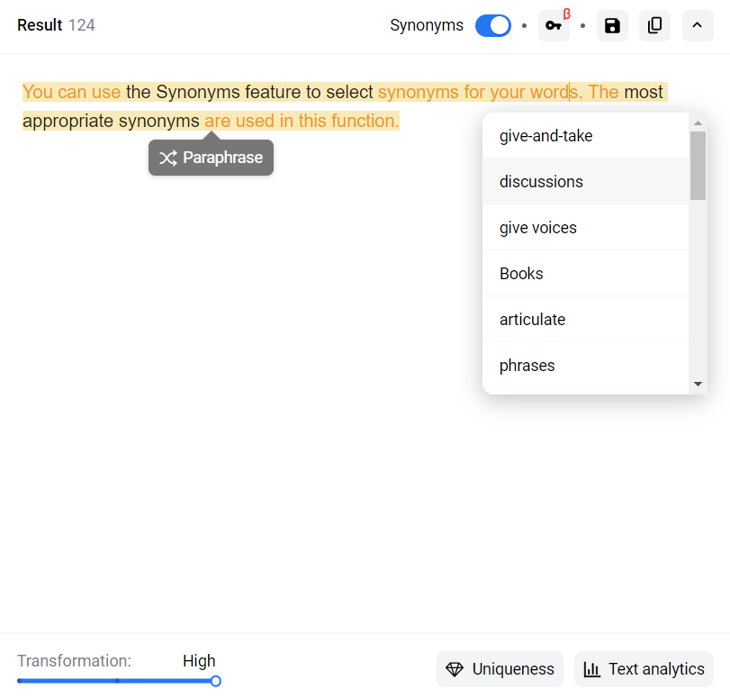 You can use a clever synonymizerThe "Neural Network" is a neural network, so you don't have to think about synonyms, but simply choose from the drop-down list any of the suggested variants.