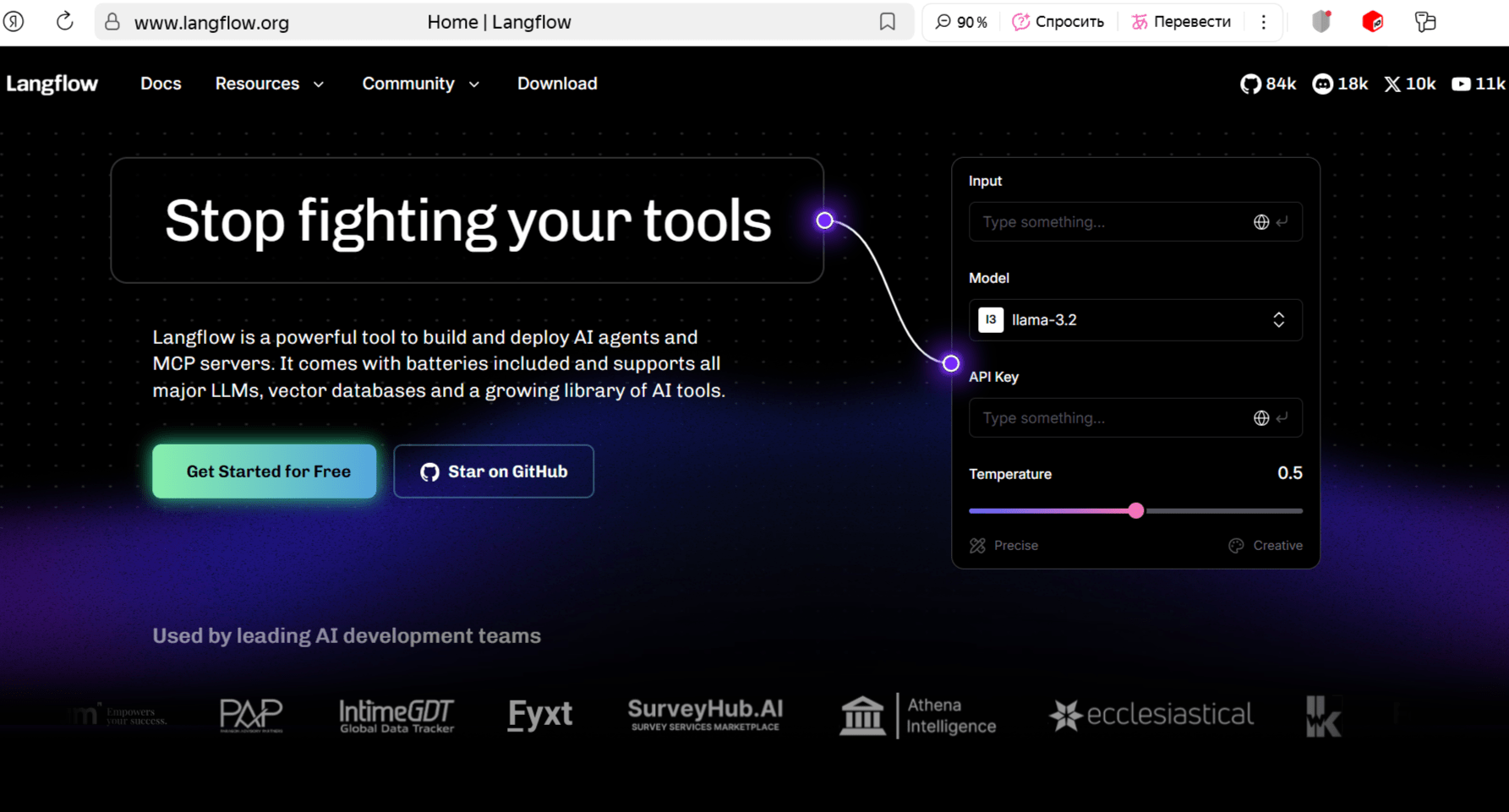 To create AI agents - install the service in Python and run the command 'pip install langflow'. The platform will start and a control panel will appear, with which you can create workflows.