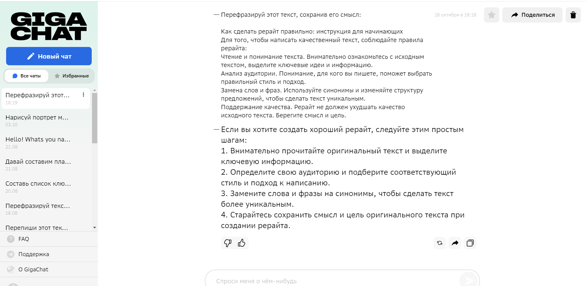 GigaChat is a multimodal from Sber that was announced in late April 2023. It already knows how to paraphrase. Access is free, but you need to register. You can see from the example that the neural network did well, and correctly identified where the list should be. But it shortened the text. Although someone will even like it better that way.