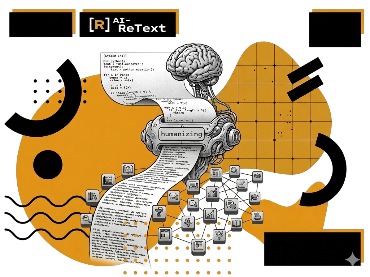 At ReText.AI, we are developing text humanization technology — an algorithm that takes text generated by a neural network and rewrites it to read as if written by a human. Not just synonym replacement, but a complete reworking of style, structure, and vocabulary.