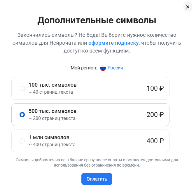 - Fee: from 100,000 characters for 100 rubles or a monthly subscription to all functions of the service for 799 rubles. Convenient for streaming work on diplomas or several essays at once. You can choose a monthly or yearly tariff, or you can just buy Neurochat characters.
