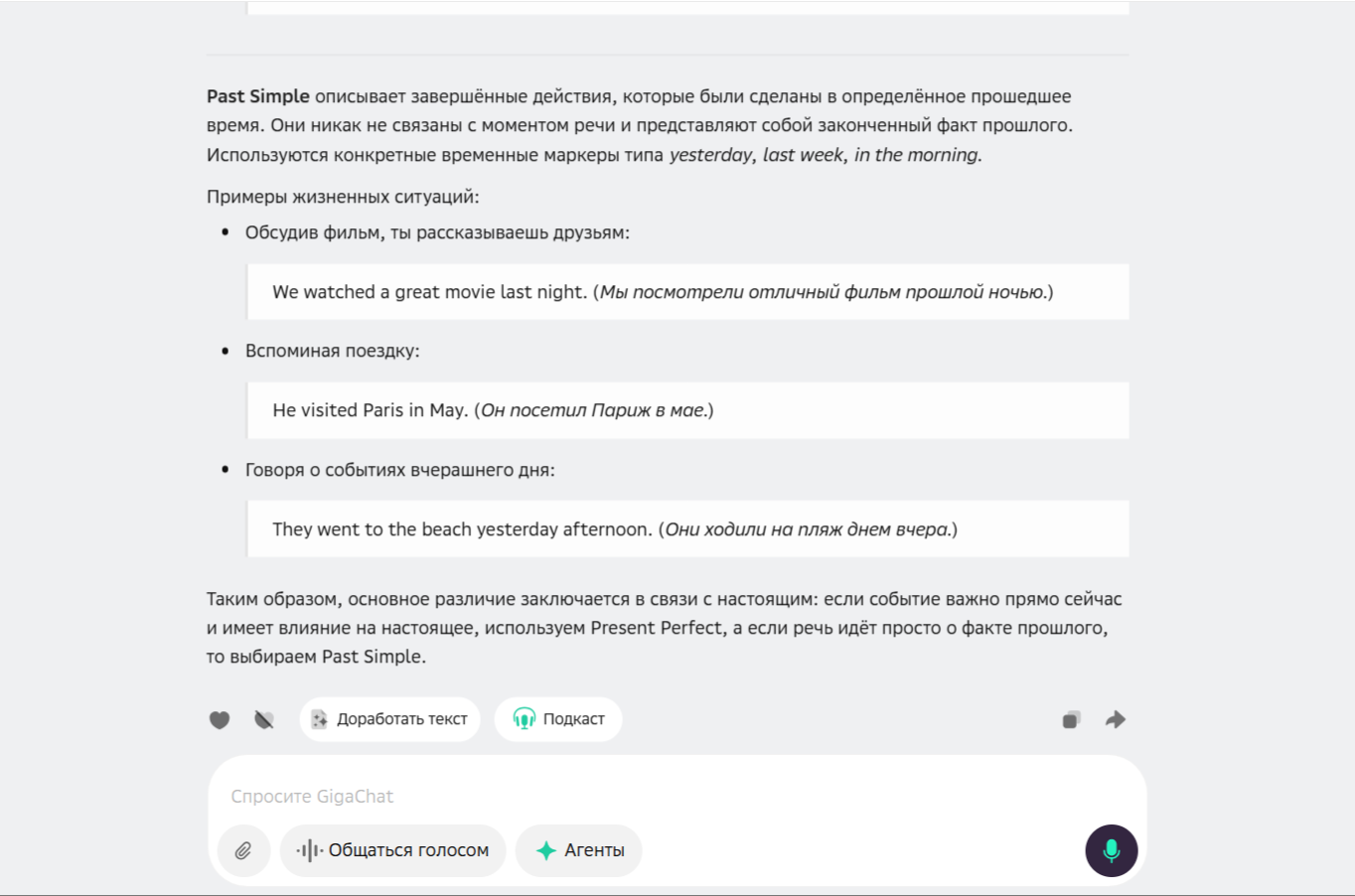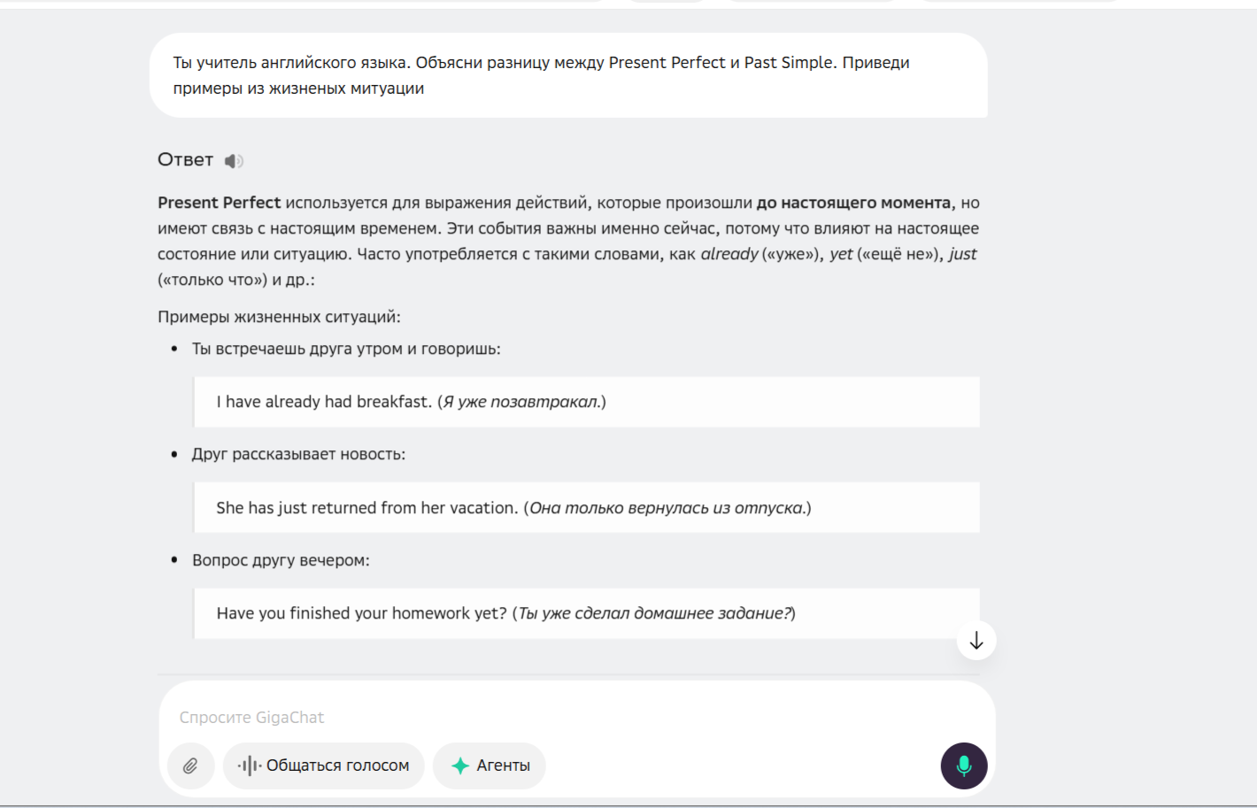 ReText.AI - combines several ways of learning and practice: from modeling dialog scenarios to checking written texts. The service is suitable for parsing assignments, explaining tenses, giving everyday examples for easy comprehension.