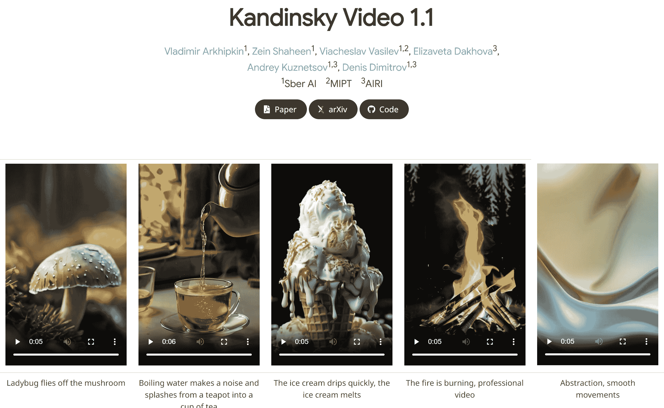 Opportunities. Kandinsky Video lineup (including 1.1 and newer releases): text-to-video and image-to-video, two-stage generation (keyframes → interpolation), motion score parameter for motion control; public materials and code/demo available.