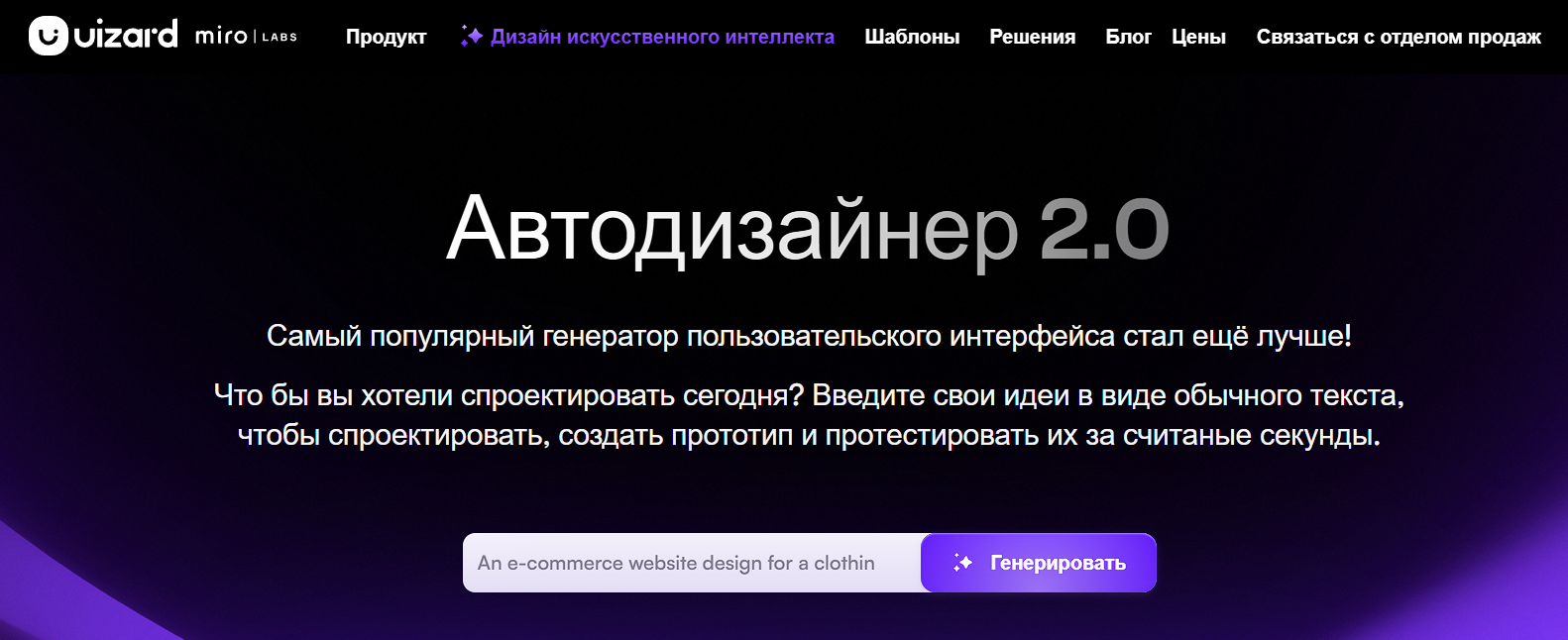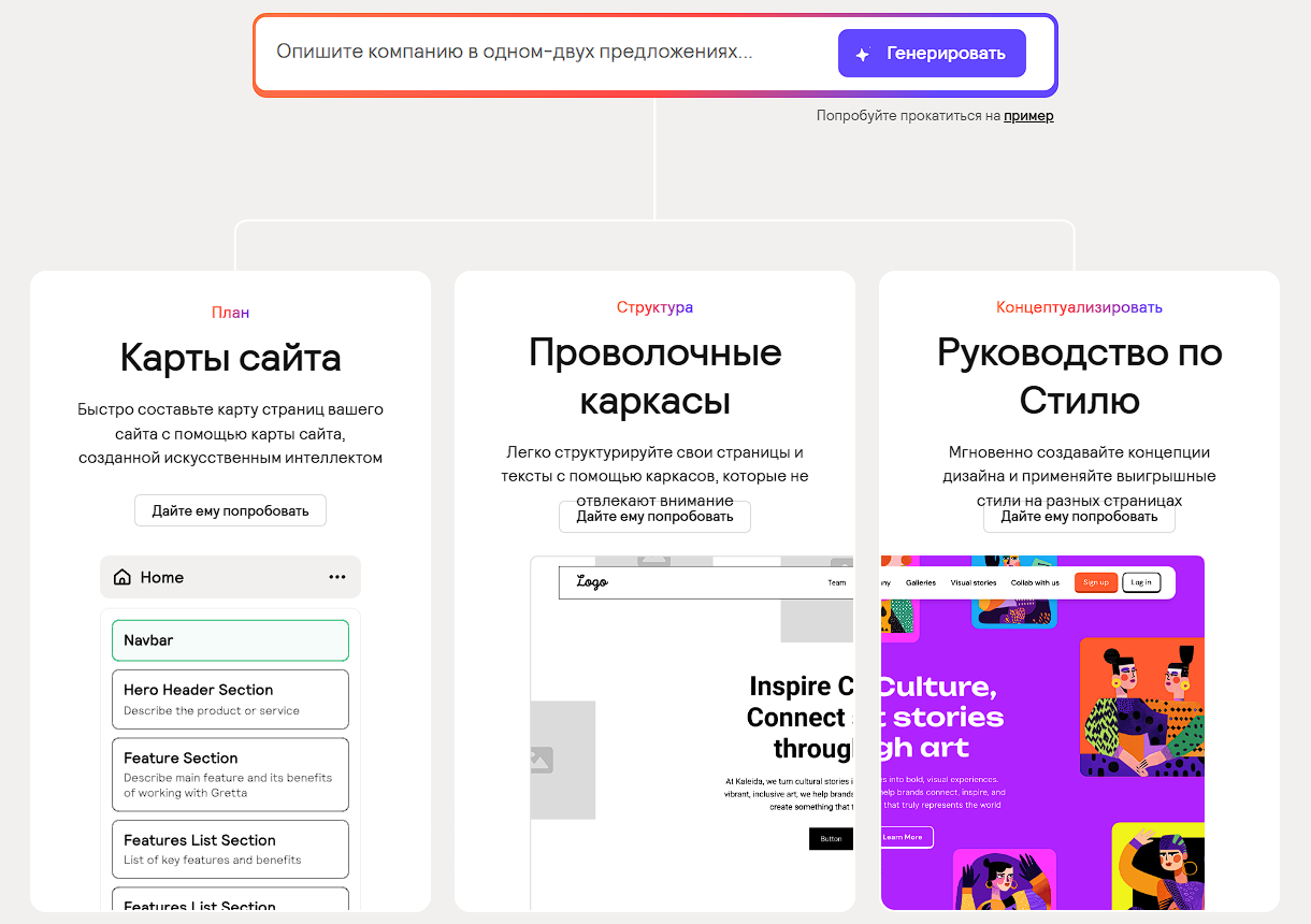 Example of use. You write a prompt - you get a multi-section prototype of the site/application, which you can edit and further develop.