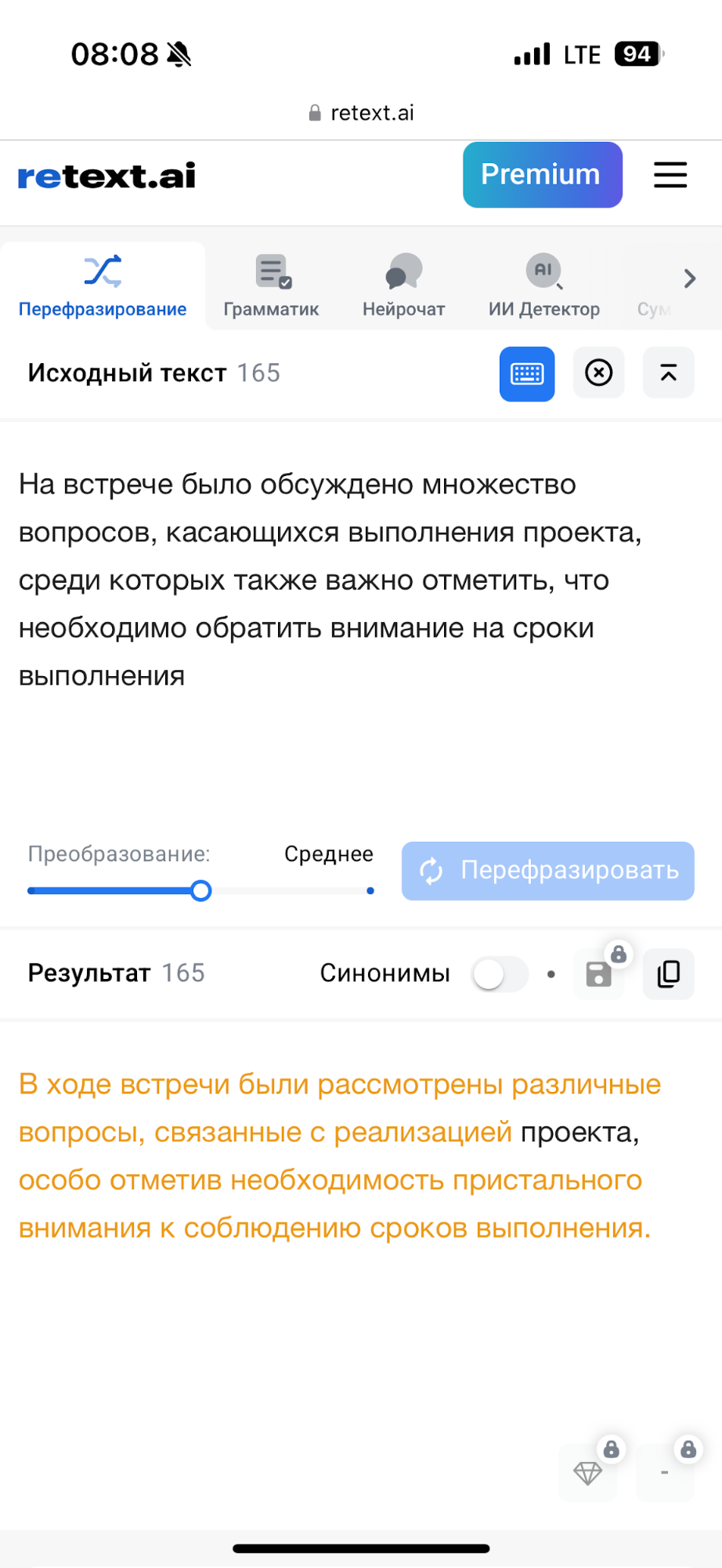 With its help you can significantly improve any text - no matter how big or small it is, no matter what it's about. ReText.AI helps you remove unnecessary words, correct errors, make the text clearer and easier for readers. The tool also allows you to check spelling and punctuation, bring the text to the required format, make it more concise without losing its meaning or, on the contrary, expand the content by adding missing details.