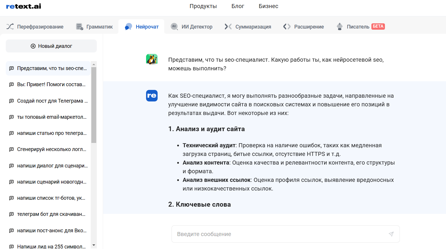 - Generation of draft texts. Neurochat writes the framework, the expert finalizes the facts and structure.