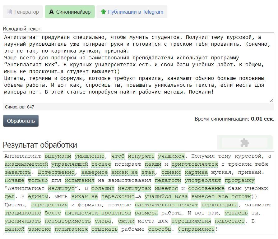This method is suitable for processing small fragments of text, individual sentences. If you try to pass an entire abstract through the synonymizer, you will get a completely unique unreadable nonsense.