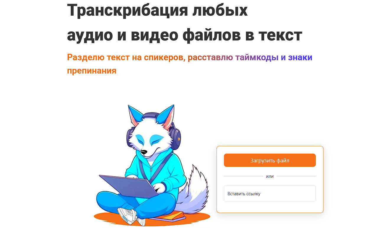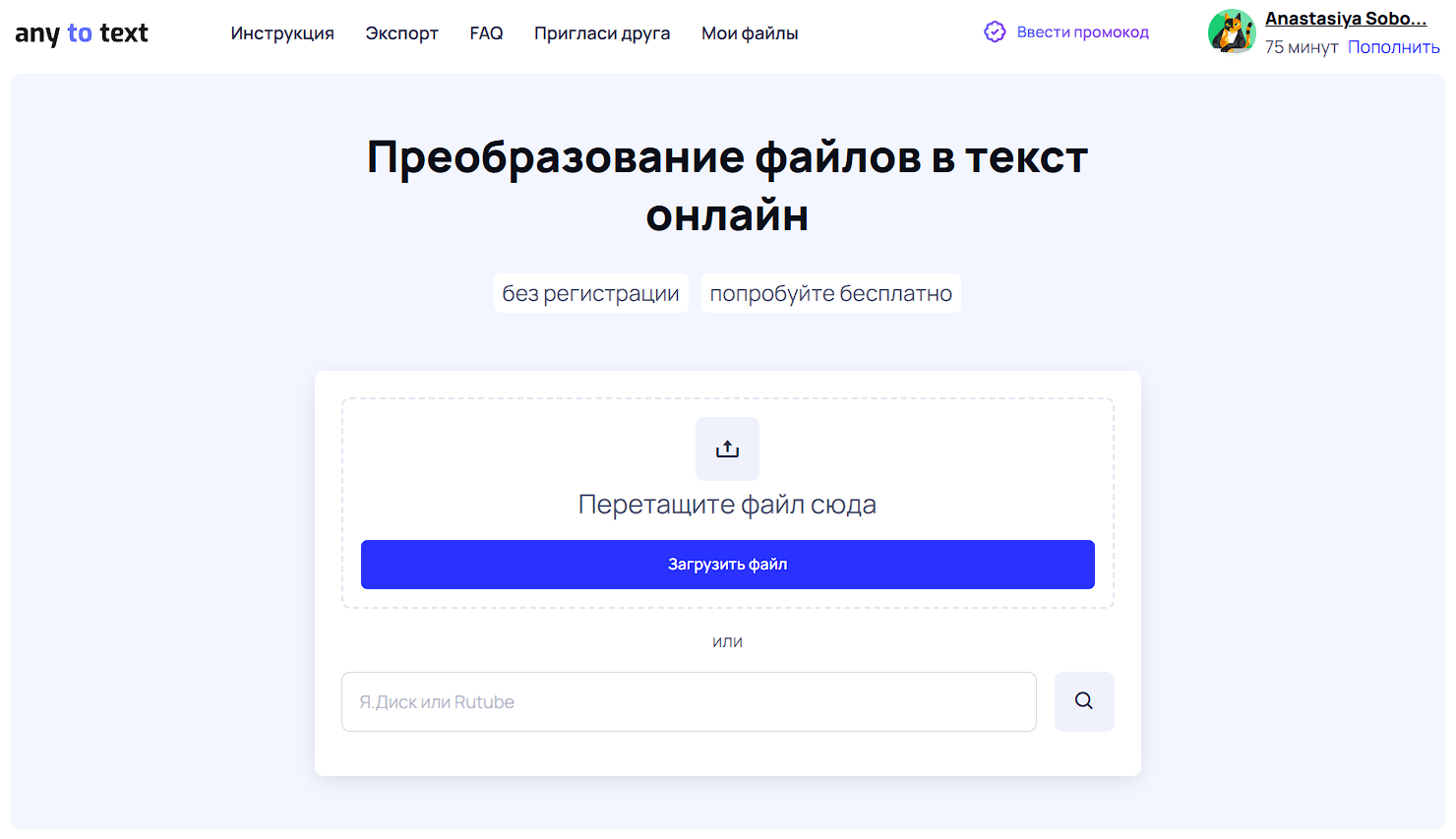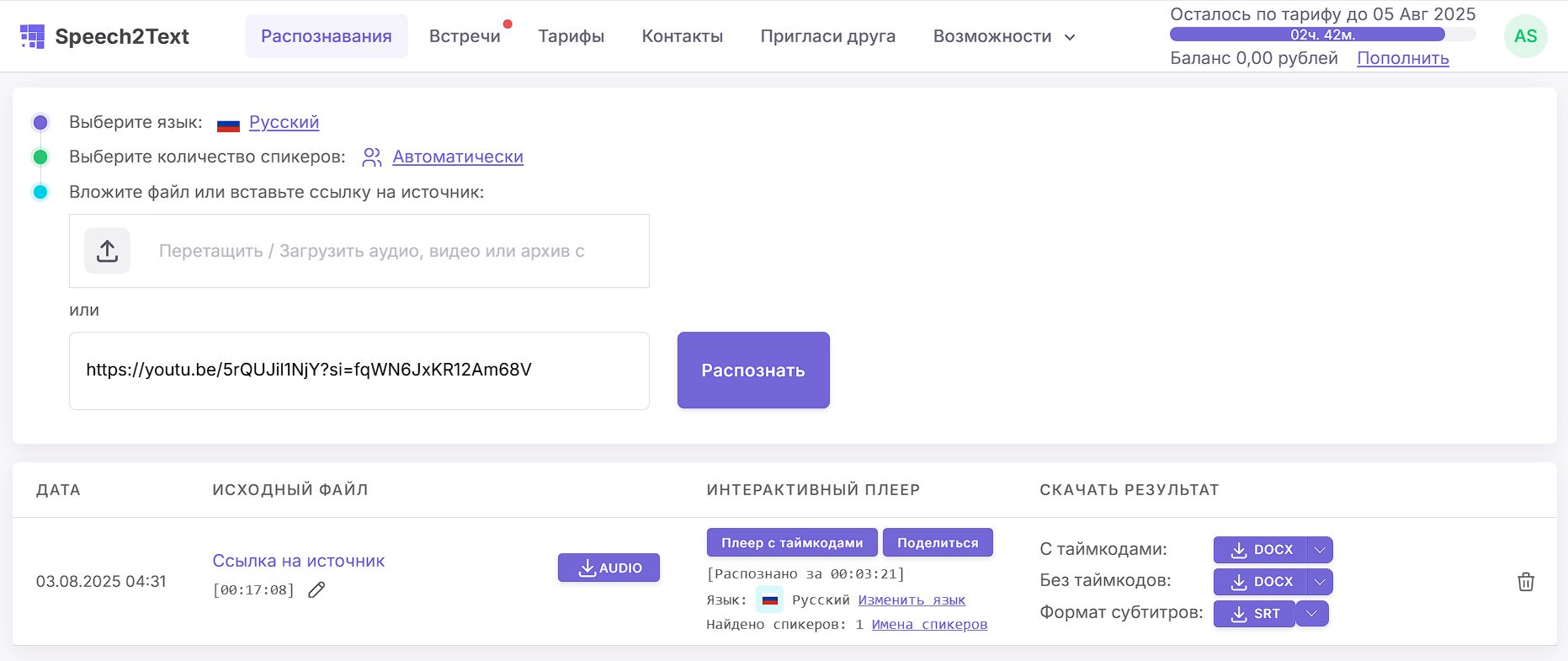 - rates: upon registration - free package of 10 min; further from 1290 ₽ for 5 h (you can upload several files in parallel). Free - files ≤10 min, linear queue, waiting up to 72 h; paid - files up to 6 h and 4 GB, higher priority.