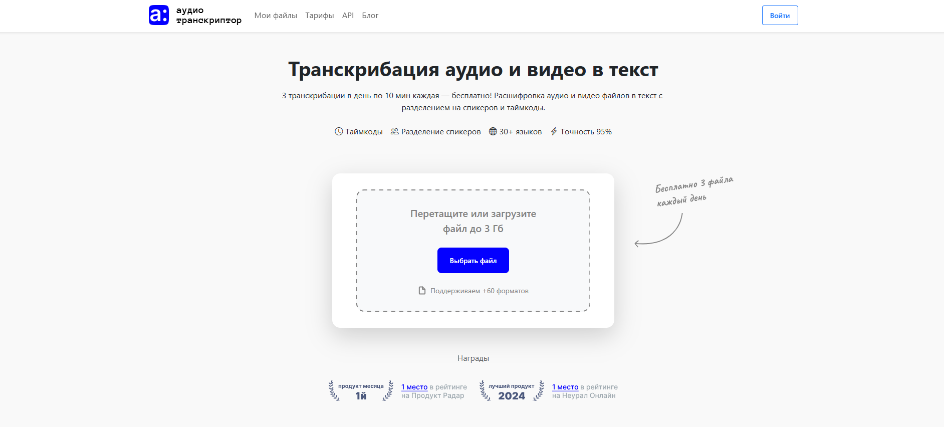 This is a Russian service for transcribing audio into text. You can submit video and audio files to the output, and you can upload up to 3 files per day for free. This is the most economical service in its segment, while it shows a high accuracy of audio tracks decoding – 95%.