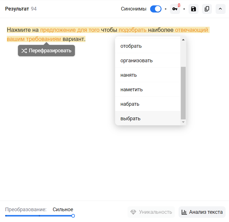 Вы можете воспользоваться умным синонимайзером, чтобы не ломать голову над синонимами, а просто выбрать из выпадающего списка любой предложенный вариант от нейросети.