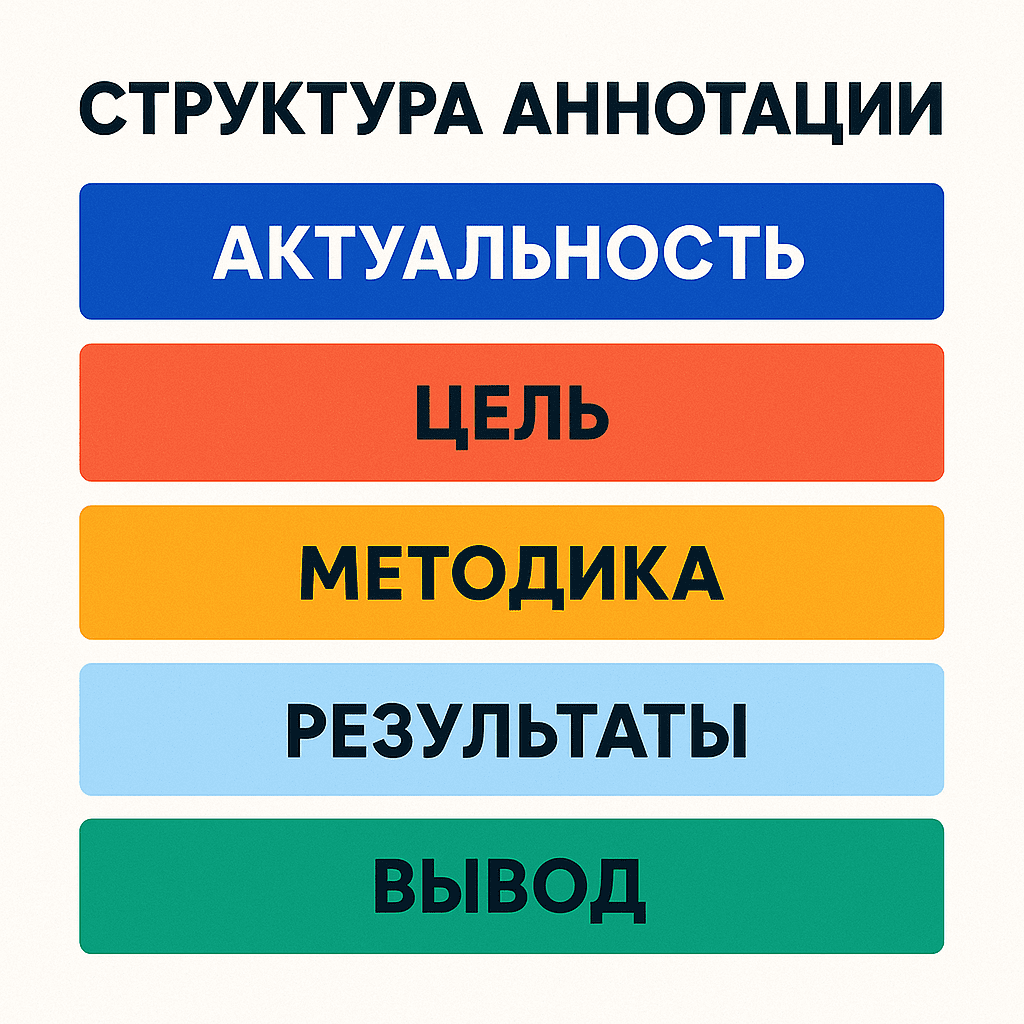 Эта пятишаговая логика формирует каркас любой аннотации. Допускается варьировать порядок, но искажать смысловые блоки нельзя: без методики неясно, как получен результат, без цели - зачем было проводить работу.
