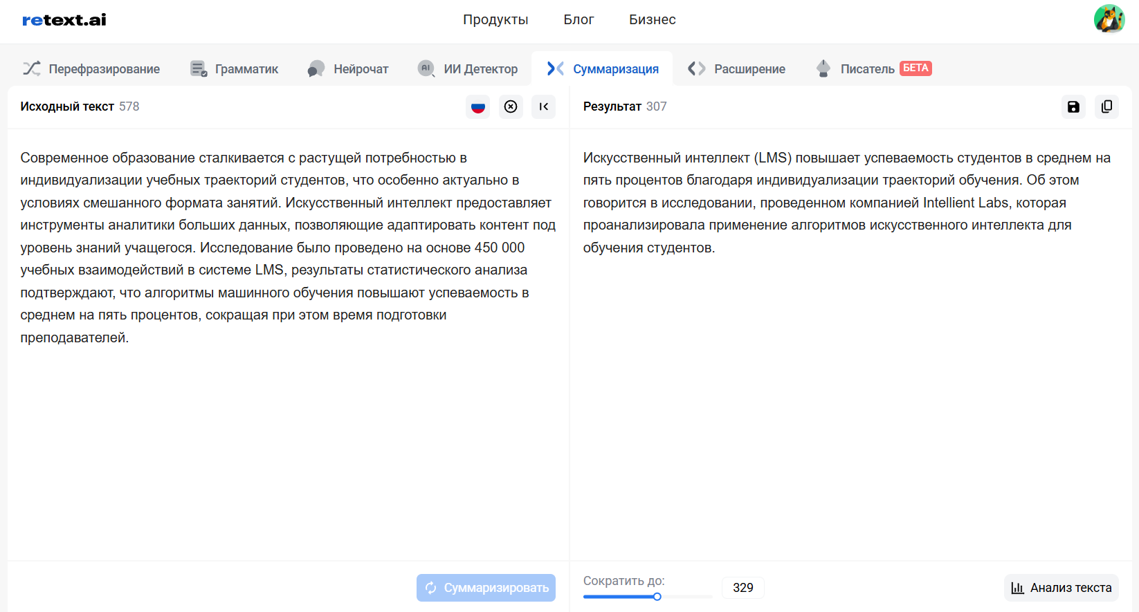 Шаг 2. вставьте текст в ReText.AI и примените суммаризацию