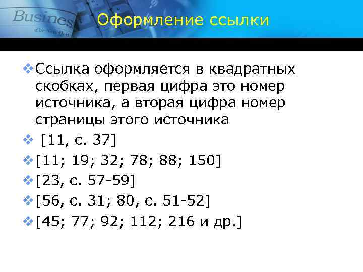 - Затекстовые — их выносят за пределы основного текста. Но при написании затекстовых ссылок (на книги, сайты) не забудьте про их нумерацию. При написании текста сразу за предложением идёт отсылка (в квадратных скобках) на текстовую ссылку, которая дает возможность читателю увидеть дополнительные сведения. Кроме того, они предусматривают указание номера страницы источника, из которого взята цитата. Так, например: ссылка [24] на 52 странице источника под номером 24 в библиографическом списке означает, что цитата взята на 52 странице источника под номером 24 в библиографическом списке.