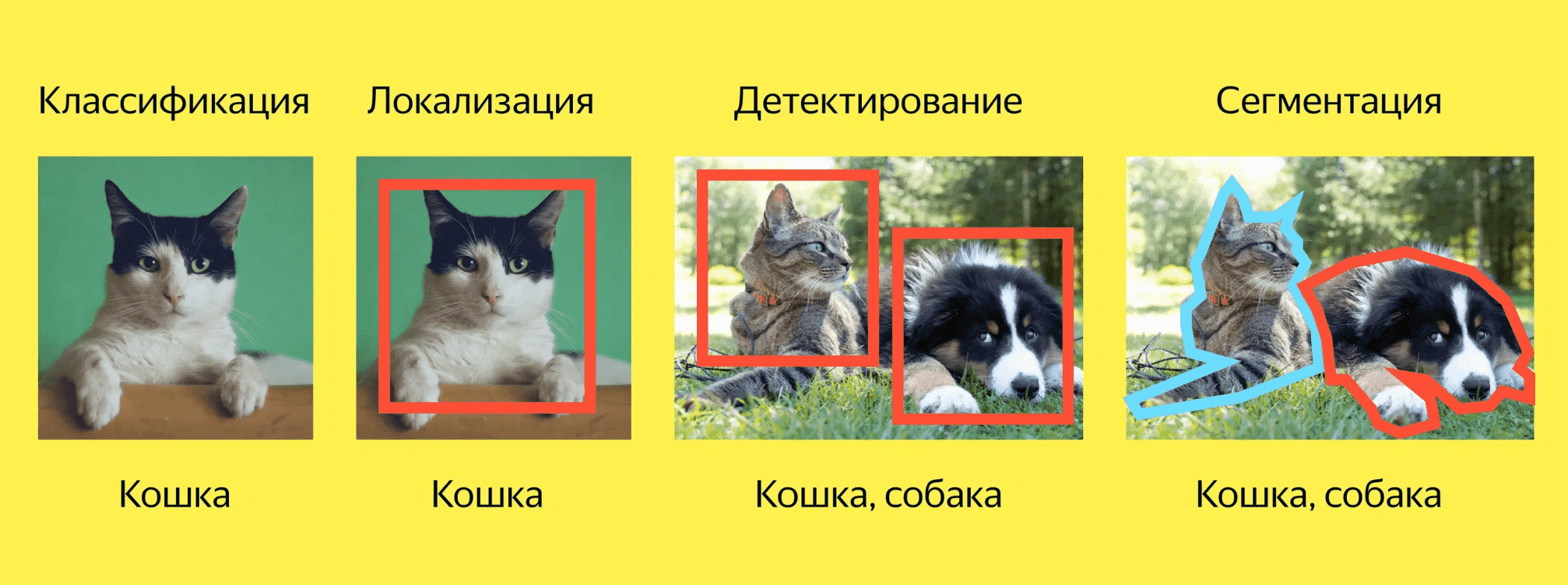 - Берём размеченные данные («здесь кот», «здесь собака»).
